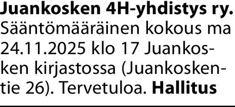 ![]() Muuruveden 4H-liikuntakerho alkaa ke 29.10.2025. klo 17 - 18 Tervetuloa! |